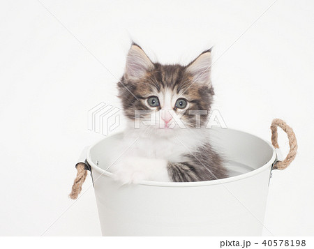 白い鉢カバーに入ったメインクーンの仔猫