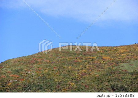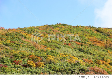 秋田県にかほ市にある鳥海山鉾立展望台から見る稲倉岳西面の紅葉の風景