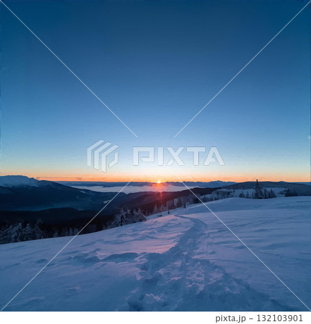 沈む太陽と雪景色と寂しげな道 魚沼市