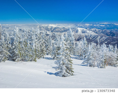 渋峠スキー場のコース脇に広がる樹氷の森と山並みの冬景色 (群馬県、中之条町)