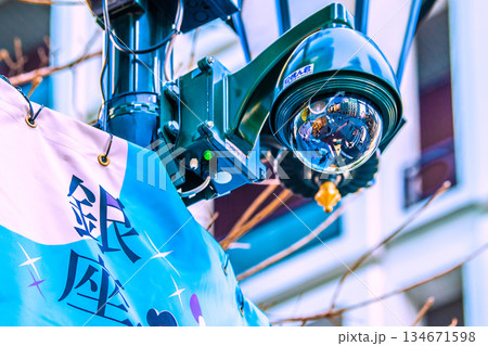 日本の東京都市景観 街角の防犯カメラ作動中。銀座みゆき通りの防犯カメラ