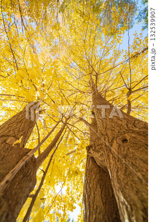 秋の黄色い銀杏と爽やかな秋空の縦画像