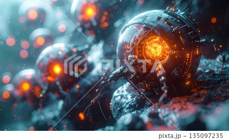 A macro close-up of a metallic spaceship and UFO flying through space like a red ladybug beetle hovering over a dark garden leaf