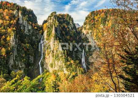 秋彩に包まれた銀河の滝と流星の滝(北海道・層雲峡)