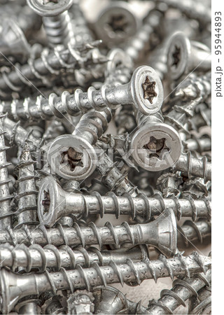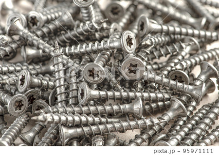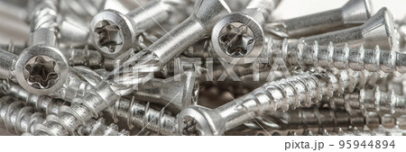 Close-up of universal silver screws with torx head. Self-tapping screws for wood, plywood or chipboard. Torx screws close up.