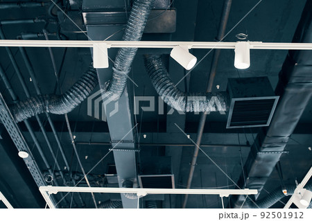 Ceiling mounted air condition units with other parts of ventilation system. Aluminum tubes, cables and vents located inside commercial hall with hanging lights and other construction parts.