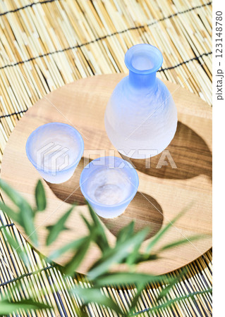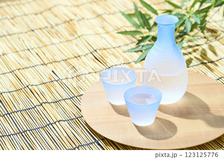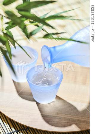 ガラスのお猪口に冷酒を注いでいるイメージ