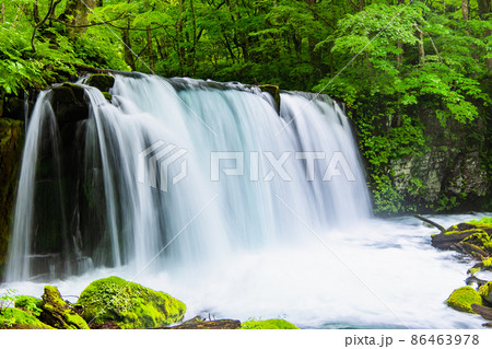 青森県十和田市の初夏 新緑の奥入瀬渓流 銚子大滝