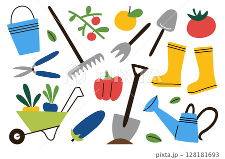 Colorful flat cartoon vector illustration set of gardening and farming tools, fruits and vegetables. Shovel, watering can, rubber boots and wheelbarrow. Concept for hobby, agriculture, eco lifestyle