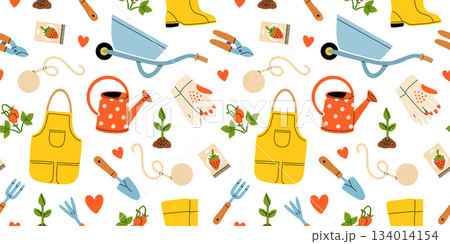 Flat cartoon vector illustration pattern with gardening tools and accessories. Seamless design for planting, farming, backyard work, outdoor activity, garden care products, watering can and shovel