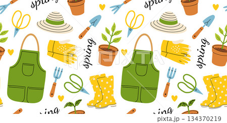 Seamless pattern with gardening tools, clothing, and pots. Summer series of flat-style illustrations. Tools for growing plants, gardening, and vegetable gardening.