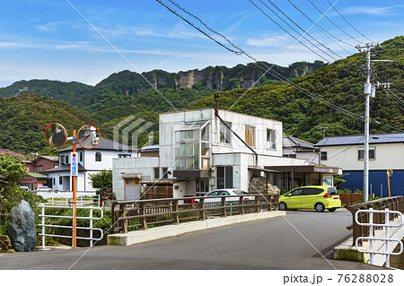 [千葉・金谷] 富津市の金谷にある鋸山案内所に通じる富士見橋と背景に鋸山の古い石切り場。