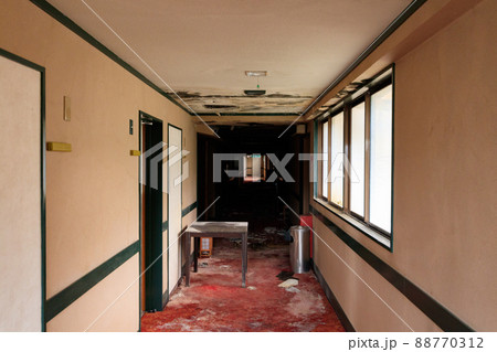 朽ちた壁と錆びたベッドが佇む、不気味な雰囲気の廃墟病院の廊下風景