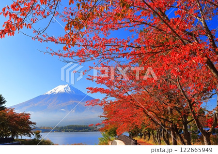 錦秋のもみじ紅葉と新雪の富士山 山梨県河口湖町