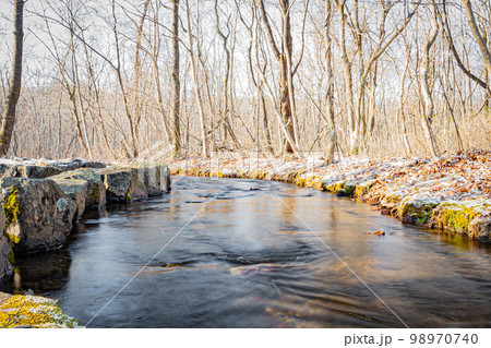 北海道苫小牧市、錦大沼公園内の小川を渡るエゾシカ【3月】