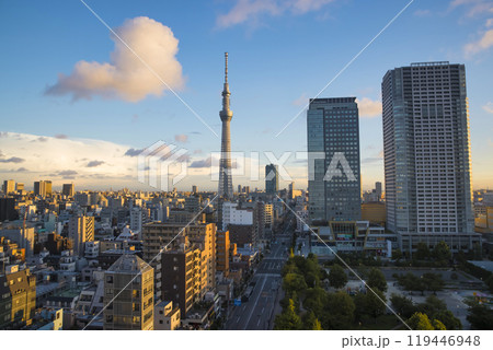 朝焼けに照らされる錦糸町から見たスカイツリー