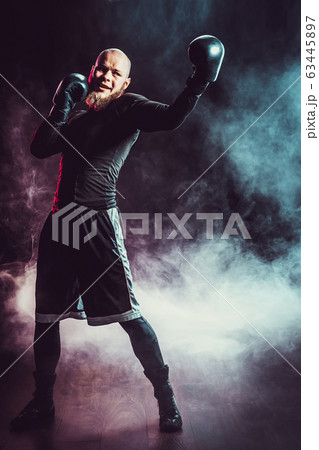 Sportsman boxer fighting on black background with smoke. Boxing sport concept