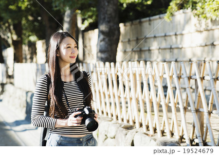 カメラを持って旅行する女性 観光地で記念撮影する女性