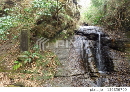 国指定史跡「朝夷奈切通」にある三郎の滝(朝比奈の滝)と石碑 鎌倉時代から続く古道の歴史的な風景