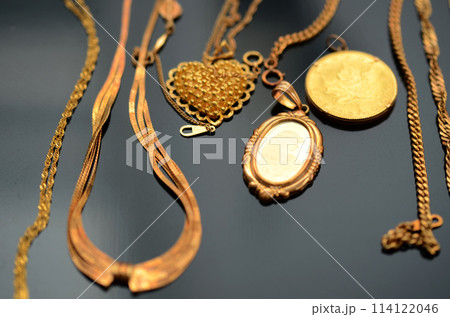 黒バックの沢山の金のネックレス