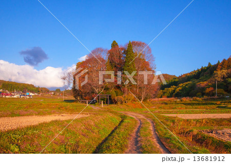 晩秋の南魚沼 鎮守の森風景 秋景色 新潟県南魚沼市