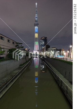 ライティング設備のメンテナンス中の東京スカイツリーと水面に映る鏡像(2017年10月)_パターン4
