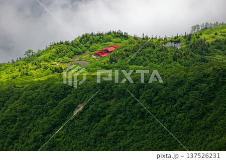 長野県にある池の平湿原の雲上の丘広場から見る池の平湿原と浅間山の風景