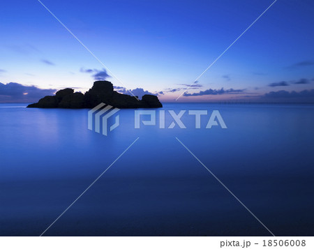 太平洋日向灘に昇る日出で黄昏色に染る前の大空に輝く星空と日南海岸のひょっこりひょうたん島に似た大島