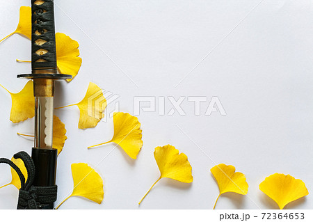 白い紙の背景の左に置いた抜きかけの日本刀と複数の黄色いイチョウの葉。右上にコピースペース。