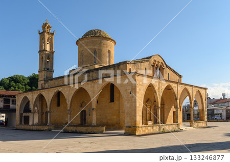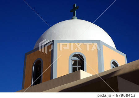 St John the Baptist Cathedral is a Roman Catholic church in Fira (Thira), Santorini, Greece. It is one of many churches in Fira, Santorini. The church has a white dome against a blue sky. Santorini.
