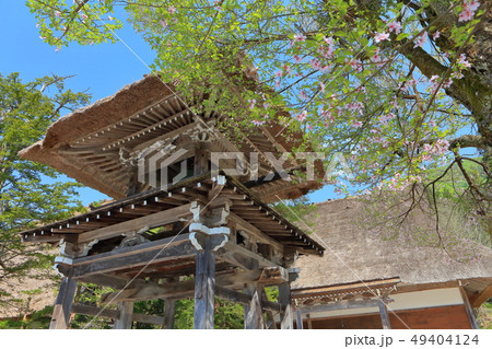 山梨県南アルプス市上市之瀬 桜の名所高峰山妙了寺 しだれ桜越しの鐘撞堂
