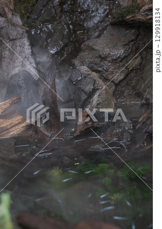 霧がかかるメダカの池のイメージ