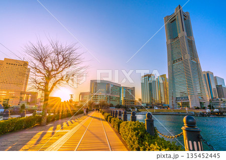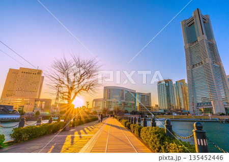 日本の横浜都市景観1月13日。汽車道から横浜ランドマークタワーや夕日などを望む