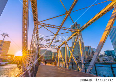 日本の横浜都市景観1月13日。汽車道から横浜ランドマークタワーや夕日などを望む
