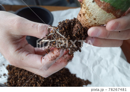 幻蝶カズラ(アデニア・グラウカ)の根をほぐす