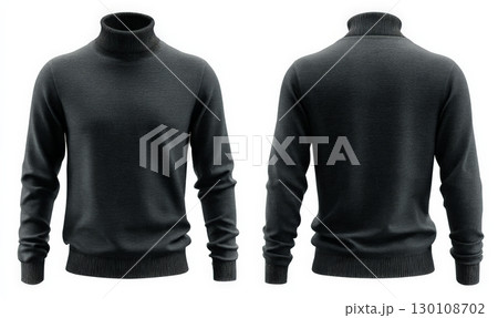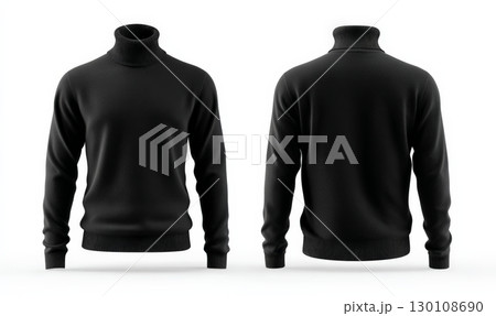 A plain black turtleneck sweater is shown from the front and back, made from a soft, warm material with long sleeves.