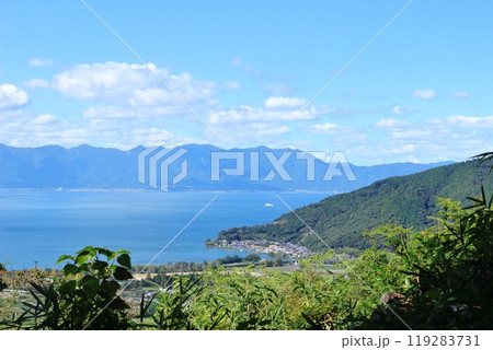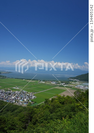 夏の八幡山から俯瞰する長命寺方面の湖岸と青空のコピースペース