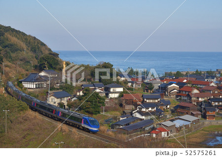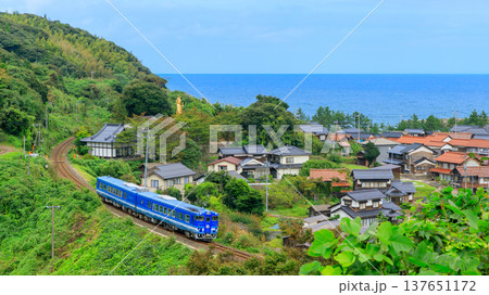 真っ青な日本海を望む高台から長和瀬の街並みと山陰本線の名物列車を撮る