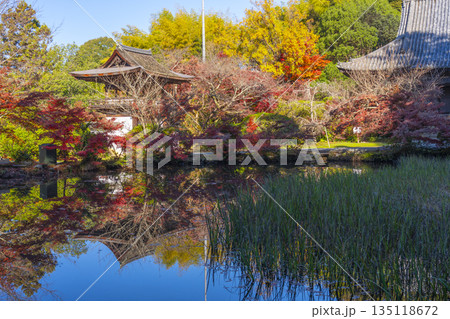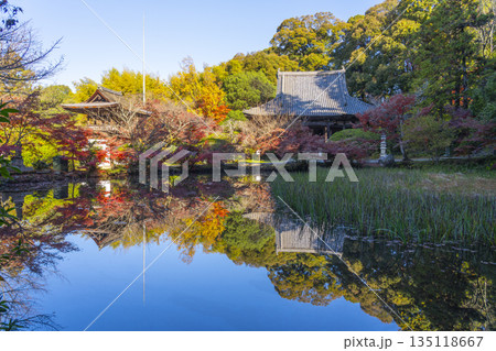 長岳寺 放生池に映る本堂 秋 紅葉の季節
