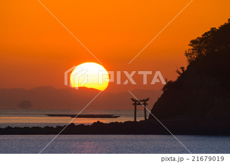 瀬戸内海の鳥居のある島から昇る朝日