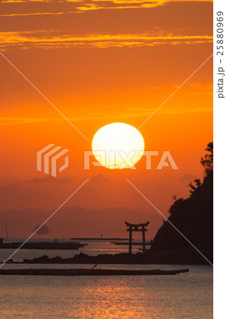 瀬戸内海の鳥居のある島から昇るダルマ太陽のイメージ