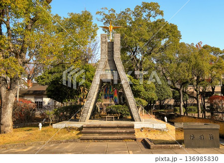 浦上天主堂遺壁の上にある「ザベリオと使徒」の石像(平和公園/長崎県長崎市松山町)