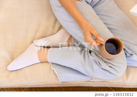 Relaxing at home, woman holding coffee cup while sitting on couch