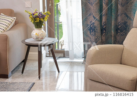 Sliding door in living room with exit to terrace. Modern furniture in Scandinavian style. Interior and design.