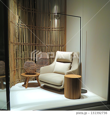 Display of furniture with a chair, table, and lamp