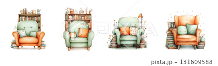 Cozy reading corner with orange armchair watercolor