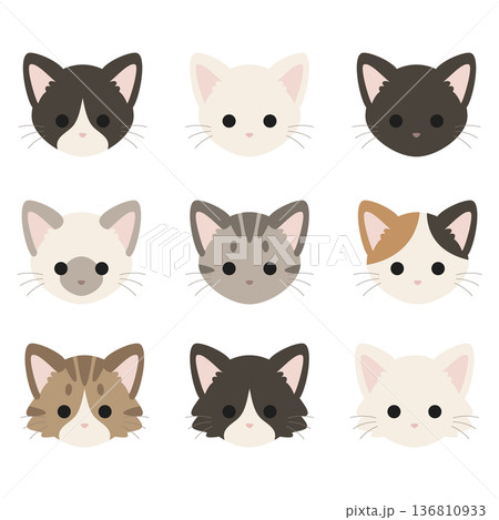 猫の顔アイコン9種セット(短毛・長毛・ハチワレ・三毛・サバトラ・シャム)シンプルベクター素材