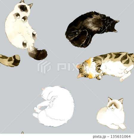 寝ている・リラックスしている長毛猫のシームレスパターン 動物・ペットの手描き水彩イラスト背景素材