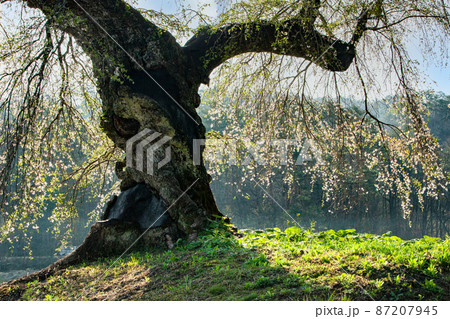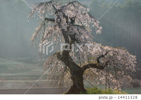 朝靄に立つ長沢のしだれ桜(広島県山県郡北広島町)