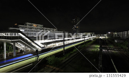 東急田園都市線の長津田駅の夜景と電車の光跡